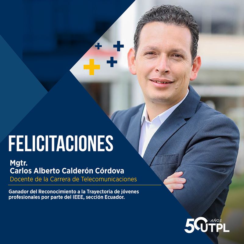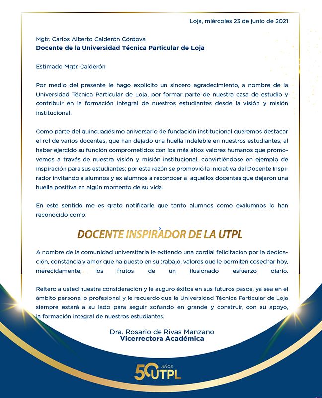 Carlos Calderon Cordova: Reconocimiento Docente Inspirador, otorgado por la UTPL por sus 50 Años de vida institucional