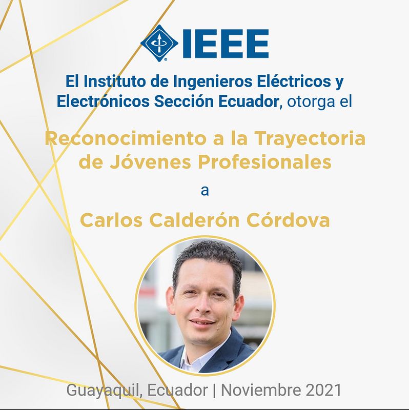 Carlos Calderon Cordova: Reconocimiento a la Trayectoria de Jóvenes Profesionales 2021, otorgado por IEEE Ecuador, Guayaquil