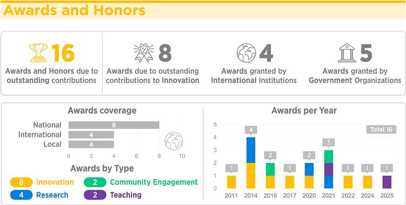 - 16 Awards and Honors due to outstanding contributions, granted by National, International Institutions (4) and Government Organizations (5).